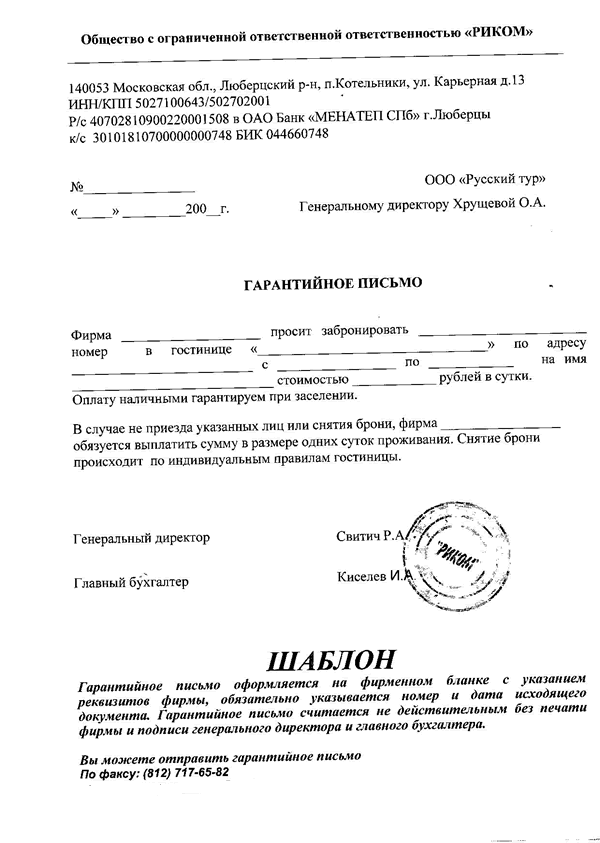 Особенностью данного вида писем является наличие наряду с подписью автора (например, директора организации) подписи должностного лица, в непосредственном ведении которого находятся финансовые или иные вопросы. Если гарантийное письмо направляется как обязательство оплаты за покупку, оказанную услугу и т. п., то в нем обязательно указываются банковские реквизиты организации-плательщика.