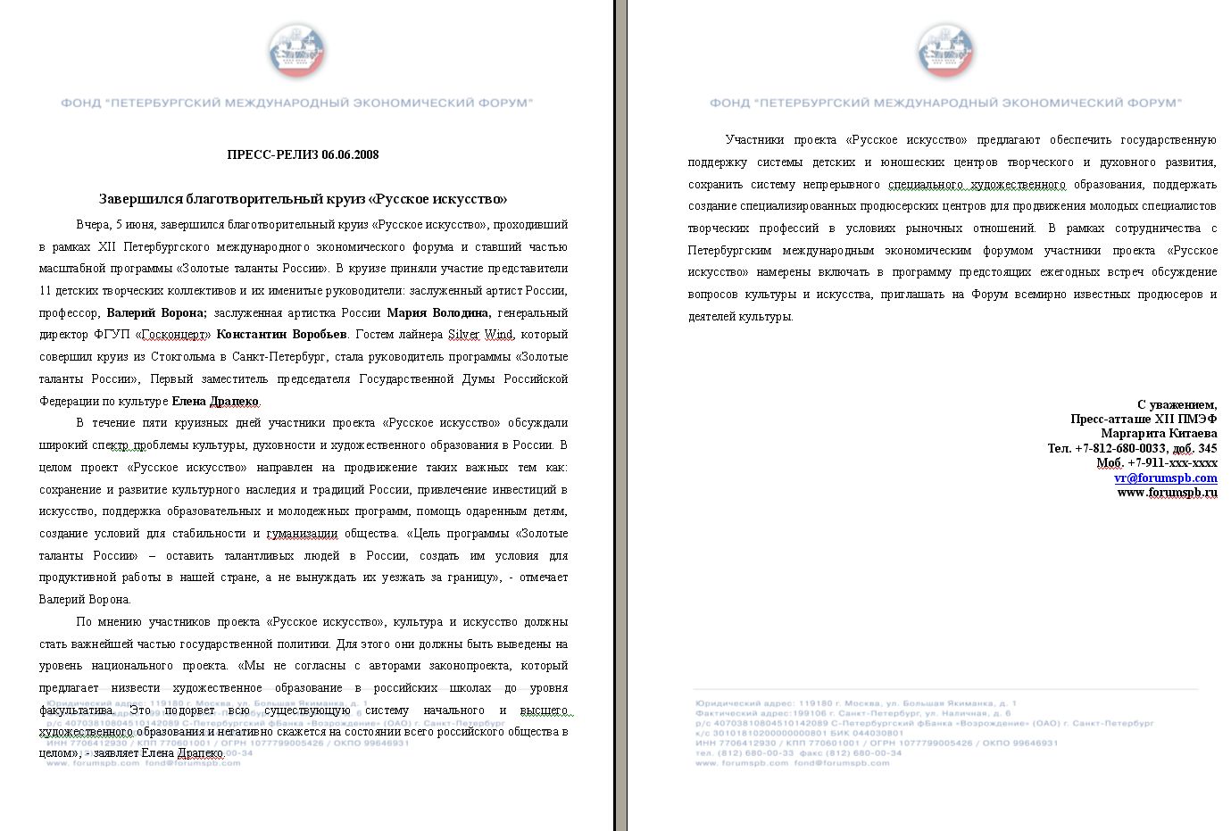 - объём пресс-релиза не должен превышать полутора страниц машинописного текста. При этом желательно ограничиться одной страницей, включая подпись и колонтитулы бланка организации;