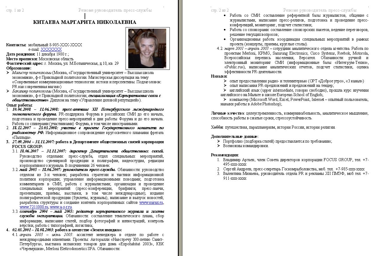 А самое главное — резюме должно быть коротким: не более одной — полутора страниц. Ваше умение ясно формулировать, кратко излагать — показатель высокого уровня общей культуры.