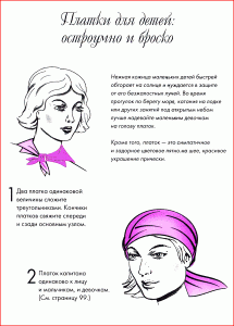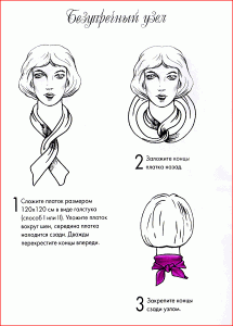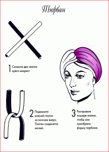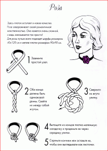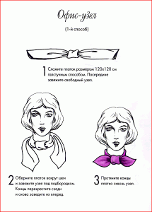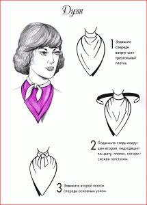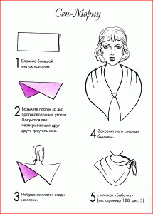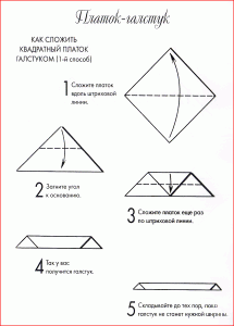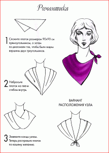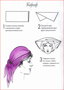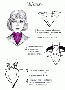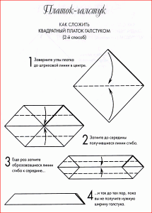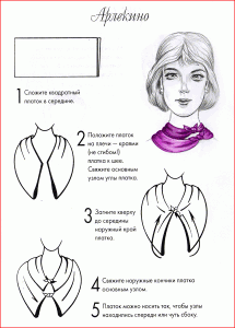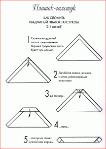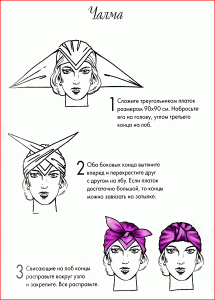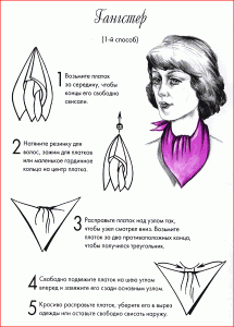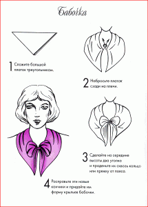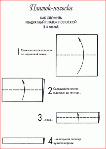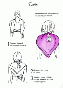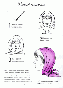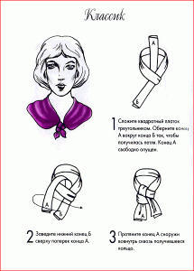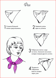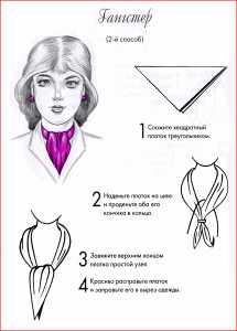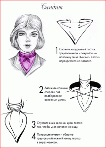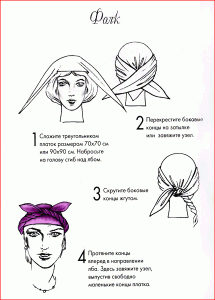 Чтобы завязать платок или косынку и реализовать какой-либо способ завязывания платков, вам понадобится аккуратность, благодаря ней, вы сможете реализовать большинство моделей, изображенных на инструкциях. Как правило, платки укладывают, начиная с исходной позиции – платок в форме треугольника, а верхняя честь поменьше нижней. Также встречаются модели, когда для начала платок нужно свернуть в полоску, причем она должна быть узкой и равномерной по всей длине, для чего понадобится определенная сноровка.